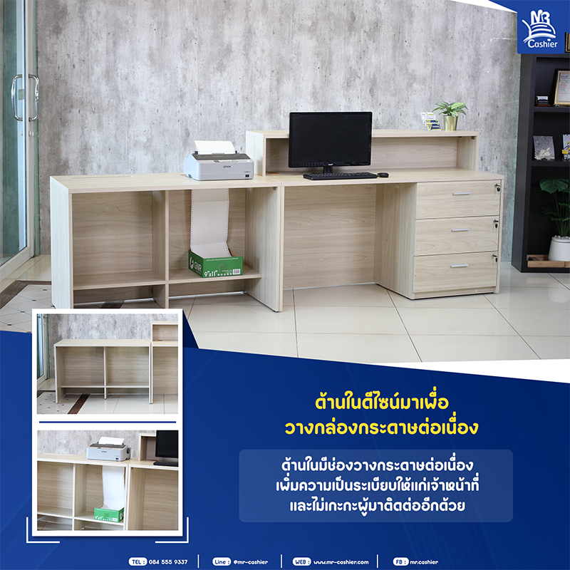 เคาน์เตอร์ต้อนรับ(จุดชำระเงิน) ที่เราเสริมฟังก์ชันเล็กๆน้อยๆก็สามารถเป็นโต๊ะทำงานออกบิล เอกสารได้ในตัวแต่หากคุณสนใจก็สามารถปรึกษาทาง Mr.cashier ได้นะคะ เรามีเคาน์เตอร์แคชเชียร์หลากหลายรูปแบบให้คุณได้เลือกสรรไปใช้งานที่เหมาะกับคุณที่สุด