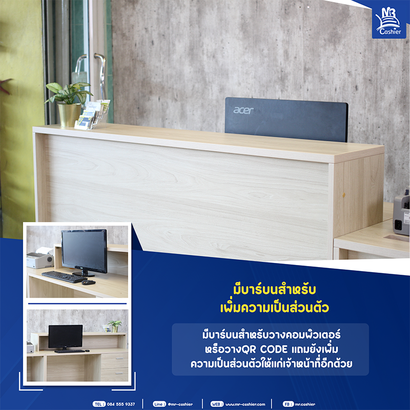 ในส่วนของบาร์บนจะสามารถวาง QR code เพื่อสแกนชำระเงินและวางคอมพิวเตอร์ด้านในเพื่อกันการมองเห็นข้อมูลสำคัญที่อยู่ในหน้าจอคอมพิวเตอร์ได้และยังสามารถบดบัง ความไม่เรียบร้อยบนหน้าโต๊ะได้เป็นอย่างดีและที่สำคัญด้านหน้าของเคาน์เตอร์ต้องมีความแข็งแรงสามารถยึดติดป้ายโลโก้ต่างๆได้ เพื่อจะสร้างความน่าเชื่อถือเพิ่มมากขึ้นให้เคาน์เตอร์ต้อนรับของคุณ